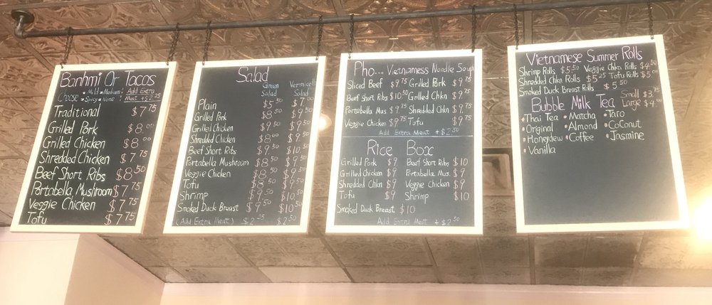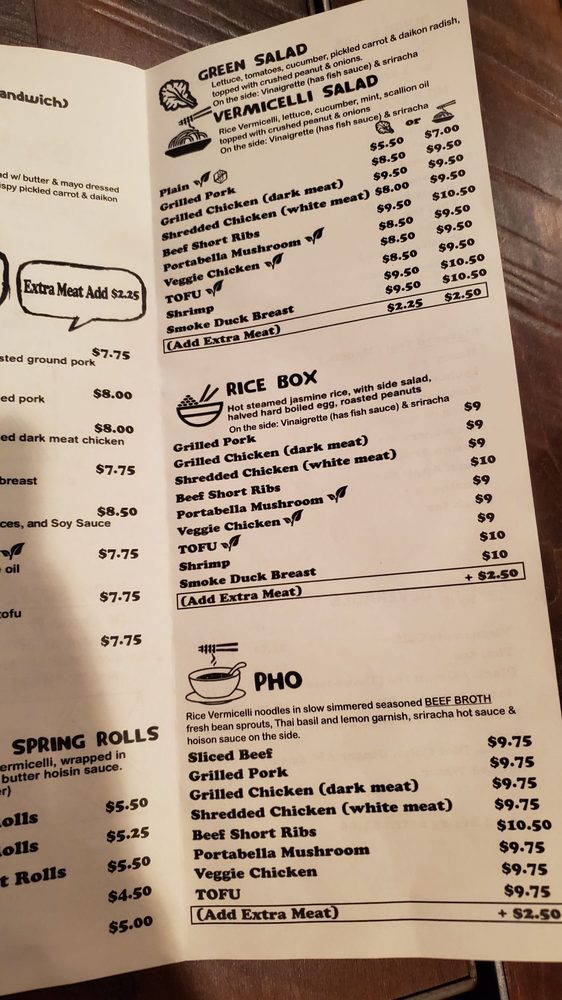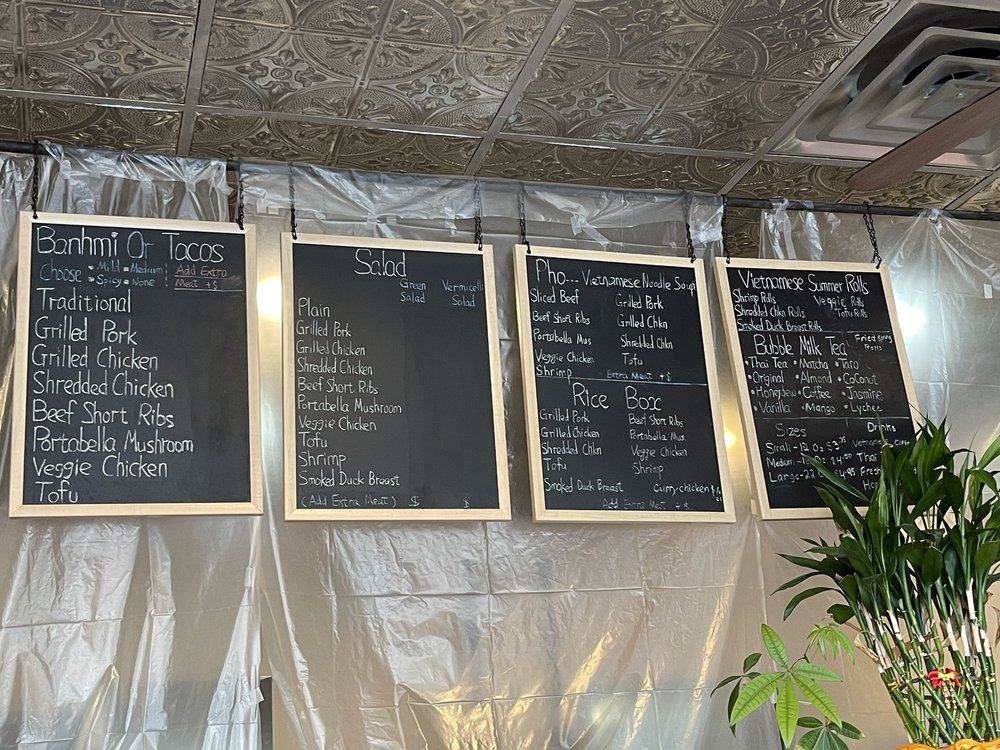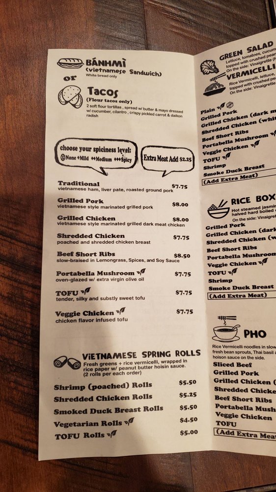 The menu highlights include traditional banhmis, featuring a crisp crust and soft interior, with options like the marinated grilled pork and chicken that promise to tantalize your taste buds. Each sandwich bursts with flavor and is perfectly complemented by house-made condiments.